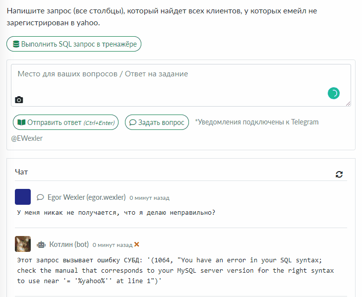 Большинство домашних заданий - это составление и выполнение SQL-запросовВы отправляете их на платформе и тут же получаете обратную связь от нашего бота